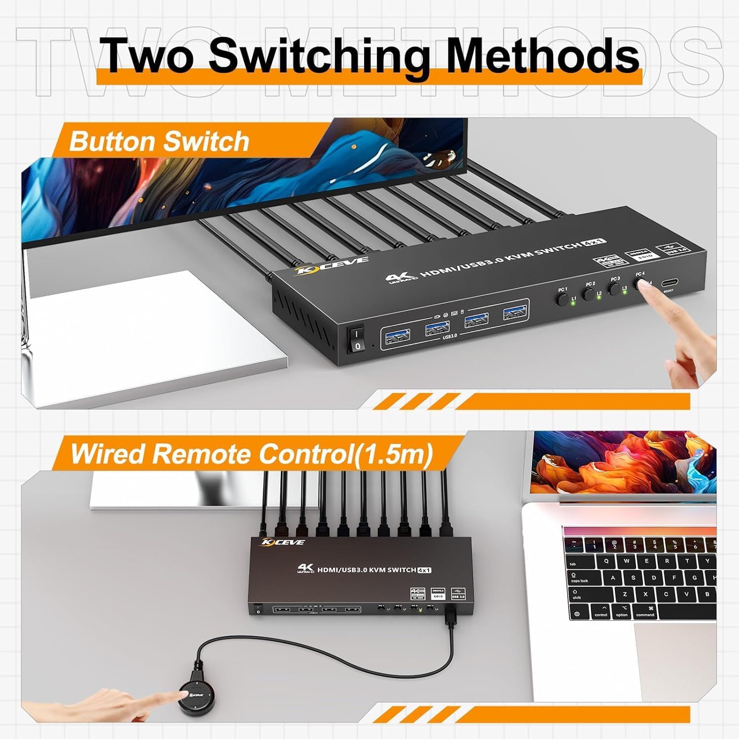 KCEVE HDMI USB3.0 KVMスイッチ 4入力1出力 PC切替器 4K 60Hz EDID保持 4つUSB3.0ハブ備えた USB切替器 ワイヤレスキーボード マウスをサポート ドライバ不要 手元スイッチ付き WWW_OPDRERGINERDOGAN_COM